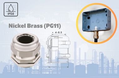 เคเบิ้ลแกลน (Cable Gland) คืออุปกรณ์สำหรับยึด รัด และป้องกันสายไฟหรือสายเคเบิลขณะที่ผ่านเข้าตู้ควบคุมไฟฟ้า เครื่องจักร หรืออุปกรณ์อิเล็กทรอนิกส์ต่างๆ โดยมีหน้าที่หลักในการป้องกันความเสียหายจากแรงดึง ฝุ่น น้ำ และสิ่งแปลกปลอมภายนอกเข้าสู่ระบบ รุ่น PG11 เป็นขนาดที่รองรับสายไฟที่มีเส้นผ่านศูนย์กลางประมาณ 4 – 8.5 มม. ตัววัสดุผลิตจากทองเหลือง (Brass) และชุบด้วยนิกเกิล (Nickel Plating) เพื่อเพิ่มความแข็งแรง ทนต่อการกัดกร่อน และยืดอายุการใช้งาน โดยเฉพาะเมื่อต้องเจอกับสภาพแวดล้อมที่มีความชื้นสูงหรือสารเคมีบางประเภท